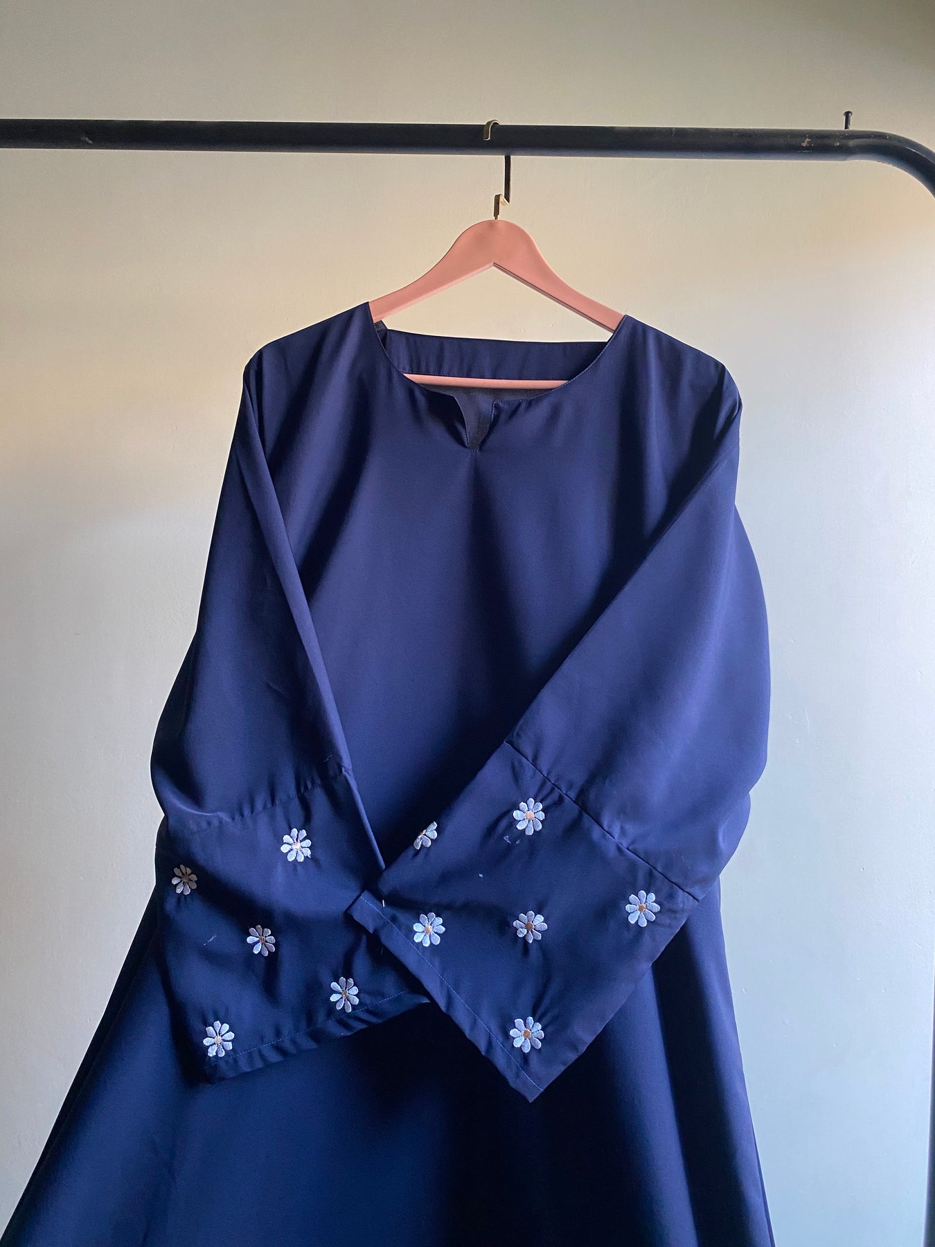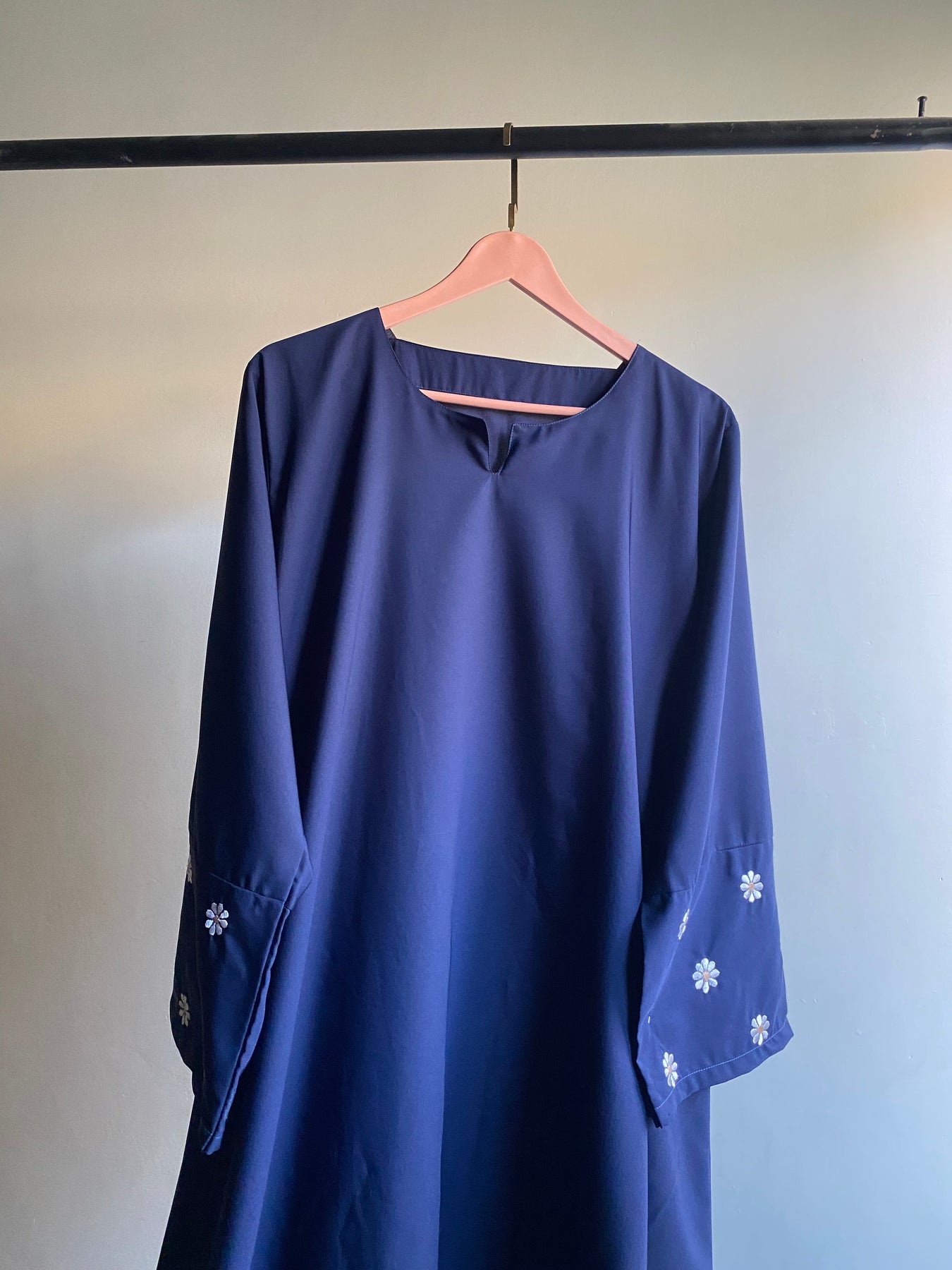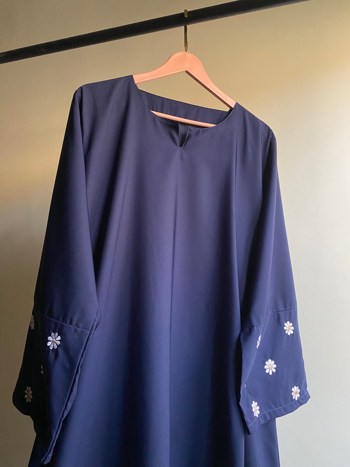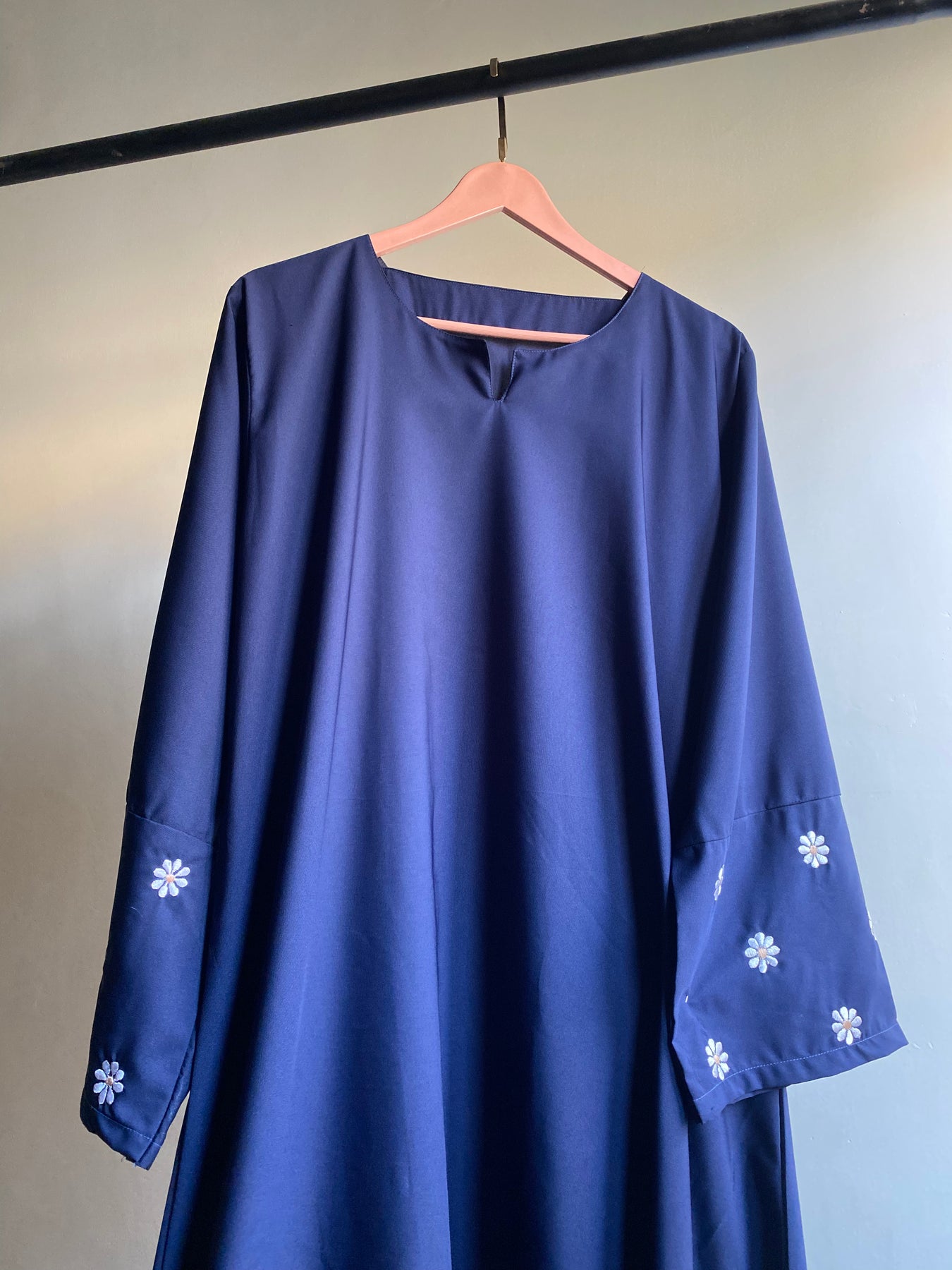 Step into effortless elegance with the Daisy Bloom Abaya, designed for women who appreciate a touch of charm in their everyday wear. Crafted from premium-quality navy blue fabric, this abaya boasts a sleek, minimalist silhouette that exudes sophistication.